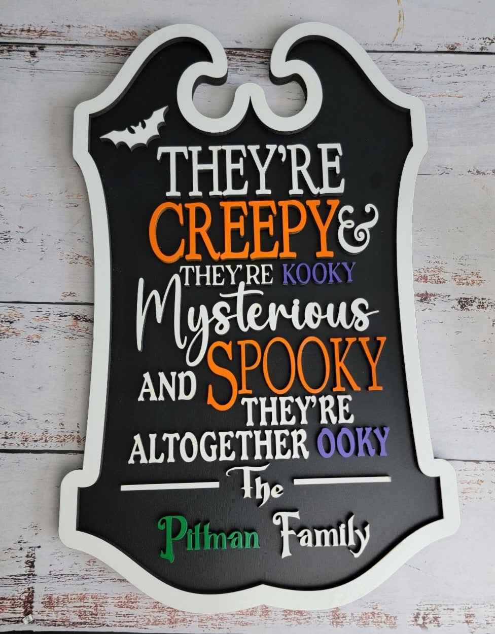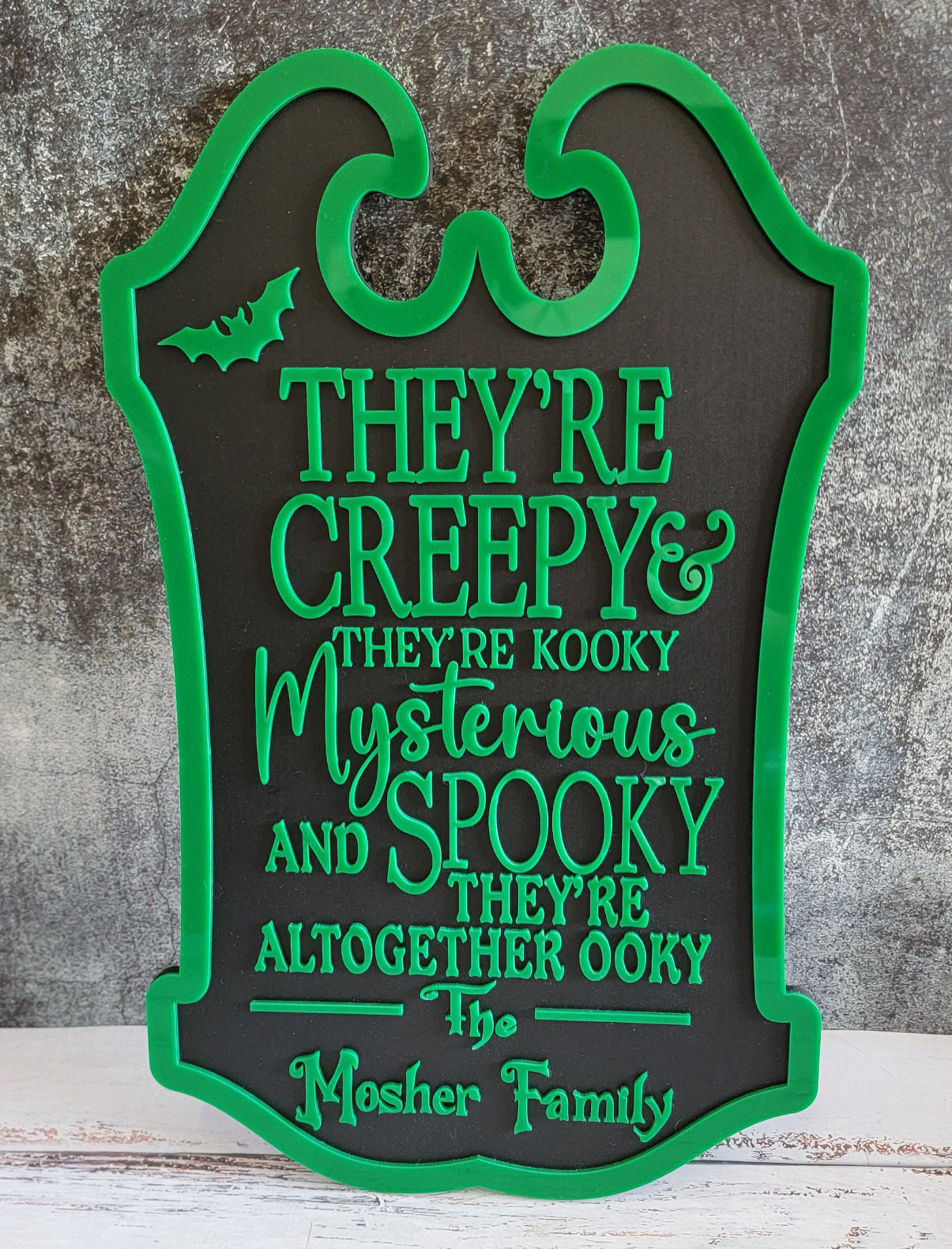 The ultimate in Halloween decorations. The Adam’s Family Song is one of the mostly widely known “Spooky” Songs and now with your name added…you are most assuredly going to love this Sign