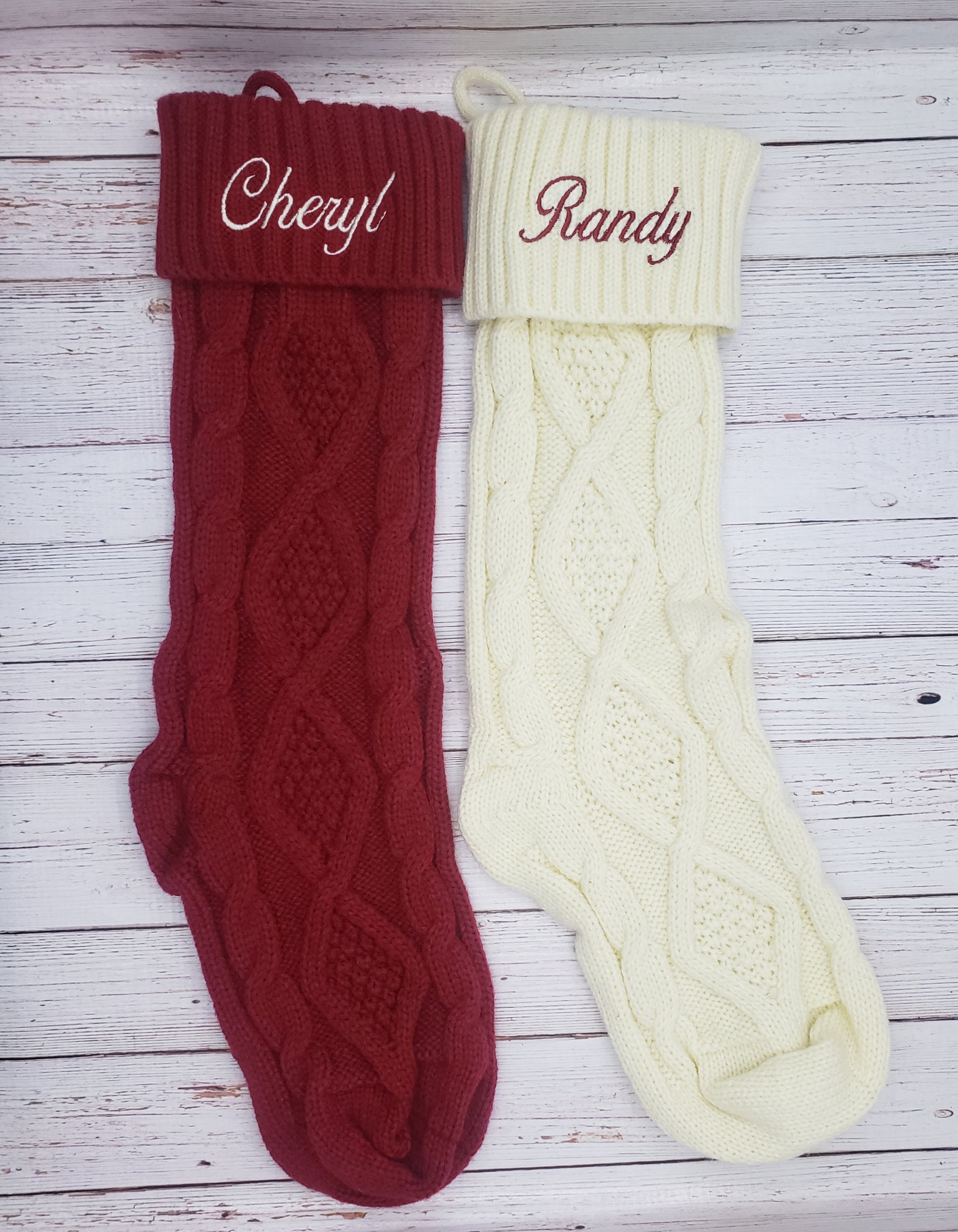 If your wanting to add a little old fashion farm house charm to your Christmas, these stockings are perfect. They come in Off White and Burgundy and are embroidered with the opposite color of thread in the Names you specify.