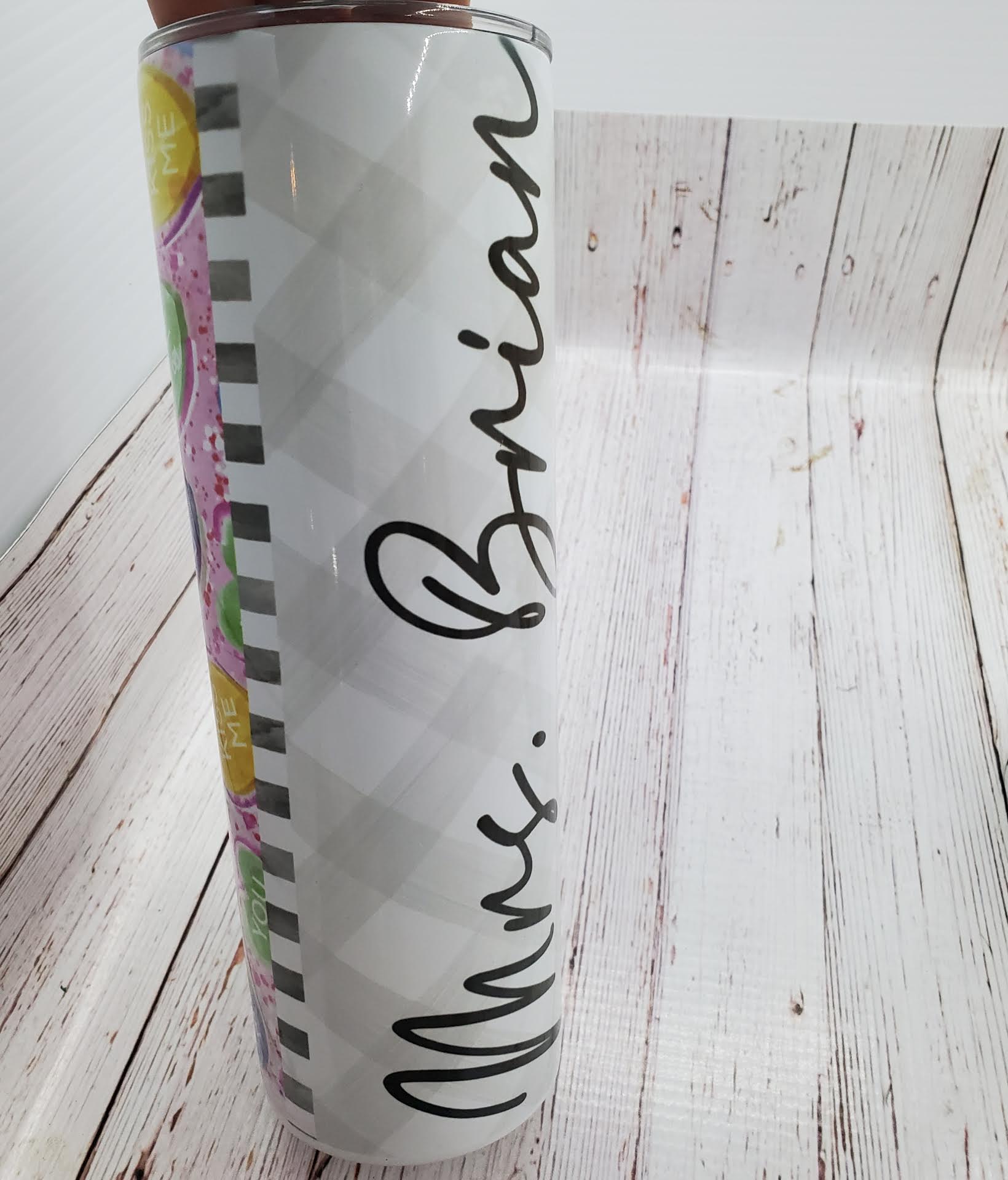 This personalized tumbler will make a perfect gift for your kids teachers, Our premium 20oz skinny tumbler with straw has a gloss finish with graphics that will never fade, peel or crack. A gift that will last a lifetime!